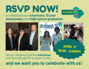 We will highlight our 10-year anniversary, FOUR new youth participants about to be high school graduates, and all the volunteers that have made this past decade of growth and service POSSIBLE!